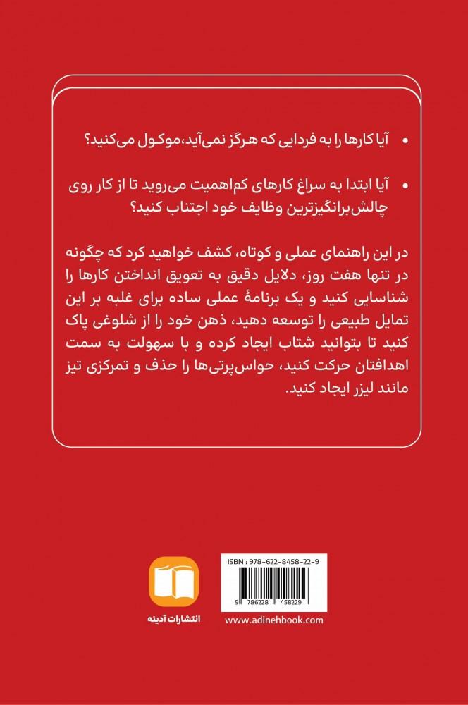 کتاب «اقدام فوری: برنامه هفت روزه برای غلبه بر اهمال کاری و بازیابی انگیزه» اثر تیبو مواریس، راهنمای عملی و ساختاریافته ای برای شکستن چرخه تأخیر و بی انگیزگی است که توسط انتشارات آدینه در سال ۱۴۰۴ به فارسی ترجمه و منتشر شده است. این کتاب با چالش بردن باور رایج «انگیزه پیش از عمل است»، استدلال می کند که در واقع «عمل، سرچشمه انگیزه» است و شروع کردن، حتی با کوچک ترین حرکت، کلید شکستن اهمال کاری است . نویسنده با ارائه یک برنامه هفت روزه مشخص، هر روز را به یک جنبه کلیدی از مبارزه با تأخیر اختصاص می دهد تا خواننده بتواند در کمتر از یک هفته، کنترل کامل بر امور خود را به دست بگیرد . روز اول با درک ریشه های اهمال کاری شخصی آغاز می شود و روز دوم بر تعریف دقیق اهداف و چیزهایی که واقعا برای شما اهمیت دارند، متمرکز است . یکی از اصول اصلی کتاب، تمرکز بر عمل کوچک و فوری به جای انتظار برای حس «آماده بودن» یا «انگیزه کافی» است، زیرا این عمل کوچک، موتور محرکه انگیزه را روشن می کند . کتاب «اقدام فوری» به شما می آموزد که چگونه با پذیرش ناتمامیت و شروع کار بدون دنبال کردن کمال، از بن بست خارج شوید . هر فصل این کتاب شامل تمرین های ساده و کاربردی است که به شما کمک می کند مفاهیم را به سرعت در عمل تجربه کنید . این اثر بر ایجاد محیطی حمایت گر برای تمرکز، مدیریت انرژی ذهنی و کاهش وسوسه های روزمره تأکید ویژه ای دارد . کتاب «اقدام فوری» برای دانشجویان، کارآفرینان، کارمندان و هر فردی که از به تعویق انداختن کارها رنج می برد، منبعی ارزشمند و کارآمد محسوب می شود. این کتاب نه تنها مشکل اهمال کاری را تحلیل می کند، بلکه راهکارهای فوری و ملموس برای تبدیل قصد به عمل ارائه می دهد. تیبو مواریس، نویسنده محبوب کتاب های رشد فردی، با زبانی ساده و مستقیم، اصول روانشناسی عملکرد را در قالبی قابل اجرا جمع بندی کرده است. خواندن این کتاب به شما کمک می کند تا از چرخه بی پایان «قصد دارم... فردا...» خارج شده و همین امروز اولین قدم را بردارید. در پایان این برنامه هفت روزه، شما نه تنها انگیزه بیشتری خواهید داشت، بلکه ابزارهای لازم برای حفظ تداوم و نظم در طولانی مدت را نیز کسب خواهید کرد . خرید این کتاب از انتشارات آدینه، سرمایه گذاری هوشمندانه ای برای افزایش بهره وری، کاهش استرس ناشی از کارهای ناتمام و دستیابی به اهداف شخصی و حرفه ای شماست. اگر به دنبال یک برنامه مشخص، بدون حاشیه و کاملا عمل گرا برای غلبه بر اهمال کاری هستید، «اقدام فوری» بهترین همراه شما خواهد بود. این اثر در بین کتاب های پرفروش حوزه خودمدیریتی و بهره وری جایگاه ویژه ای دارد. ترجمه روان و دقیق نسرین امامی، خواندن و درک این کتاب را برای مخاطب فارسی زبان بسیار ساده تر کرده است. کتاب «اقدام فوری» به شما یادآوری می کند که موفقیت نه از صبر، بلکه از شروع کردن آغاز می شود. با مطالعه این کتاب، شما می آموزید که چگونه ترس از شکست یا ناتمامیت را به وسیله اقدام کوچک و مداوم به چالش بکشید . این کتاب خلاصه ای از دانش روز روانشناسی مثبت گرا و علم بهره وری است که در قالب یک برنامه هفت روزه کاربردی در اختیار شما قرار گرفته است.